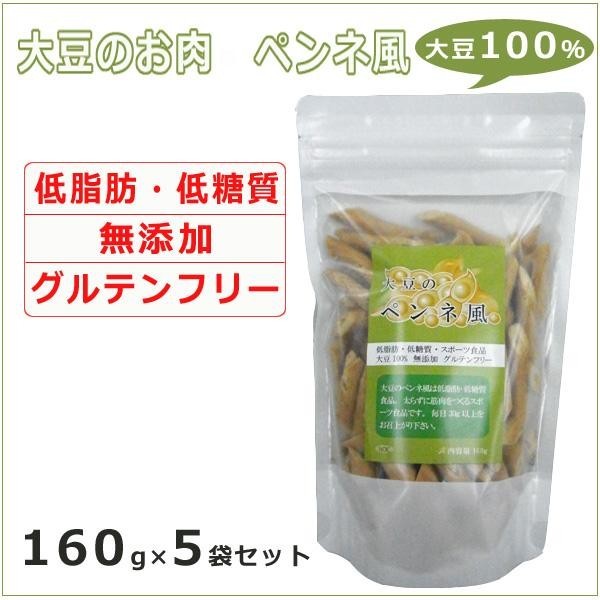 | 大豆100%使用でペンネ風に仕上げた、低脂肪・低糖質の大豆のお肉です。大豆の主成分である、たんぱく質、食物繊維がたっぷり含まれています。パスタ、炒めもの、揚げ物、煮物、サラダなどにお使いいただけます。毎日30g以上を目安にお召し上がりください。 |