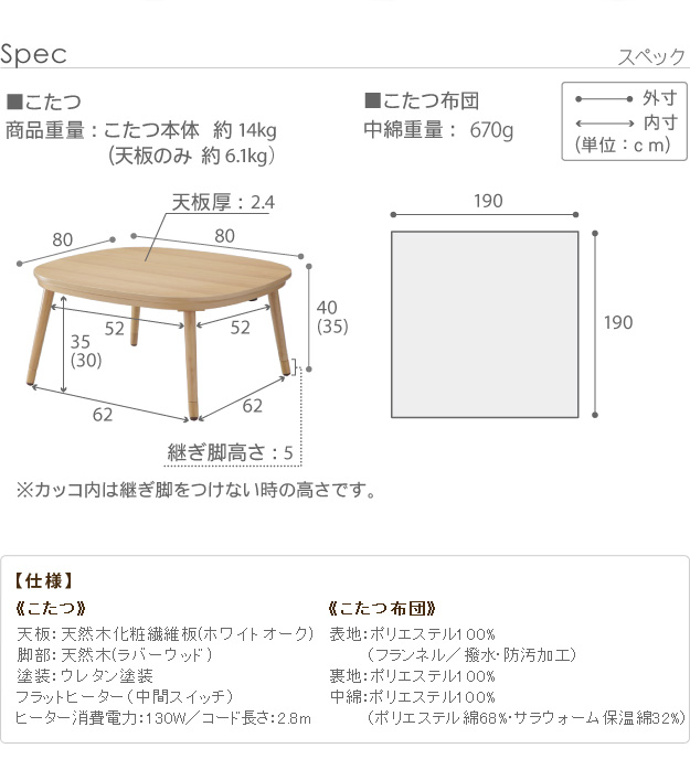 ●幅80x奥行80x高さ35/40cm(継脚5cm)