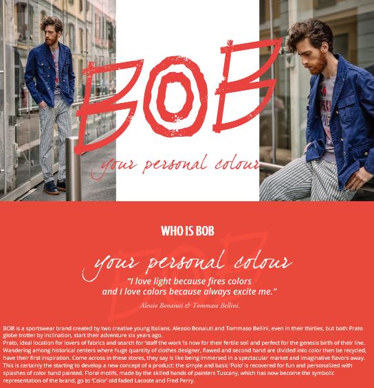 기존 이탈리안 클래식 의류 브랜드는 남성적이고 무게감 있는 스타일이 강했다면, BOB는 보다 가볍고 세련된 캐주얼을 보여준다.
