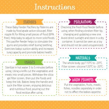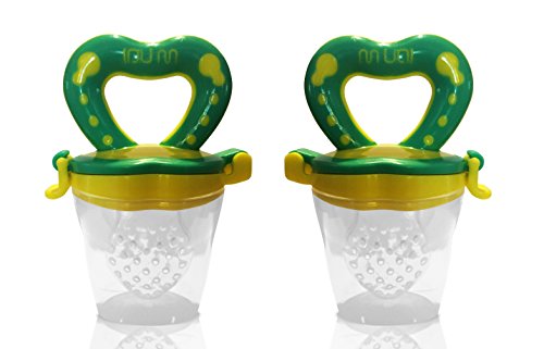 -. Feature : INTRODUCE BABY TO SOLID FOOD AND SOOTHE SORE GUMS AT THE SAME TIME. Safe, choke-free teething pacifier can be used to add variety to baby's diet and to help ease the discomfort of teething. Durable food-grade silicone mesh nipple withstands repeated chewing, letting baby eat soft food in a slow, controlled manner. / FILLING IS QUICK AND EASY. Simply unlatch the top of the pacifier, flip open, and add fresh or frozen fruits, veggies, meats, ice chips, or other solid foods. Then latch the top for a self-contained food delivery system that little fingers can't easily pry open. / DESIGNED WITH SAFETY IN MIND. The mesh nipples are made of durable food-grade silicone, and the top latches to keep food securely stored. Pacifiers are BPA free, lead free, petroleum free, latex free, and phthalate free. / MINIMIZE MESSES. Each 2-pack comes with 2 identical pacifiers and 2 coordinating snap-on caps to keep the nipples covered. Easy-to-clean silicone mesh is stain resistant and won't spot like similar products. / LOVE IT OR YOUR MONEY BACK. We are a small family-owned business and proudly offer only top quality products with 90 Day manufacturer warranties. If you ever have problems with the unit or any of the accessories, our US-based customer service team will replace it right away. Email 4amazonsuppt@gmail.com at any time to receive support