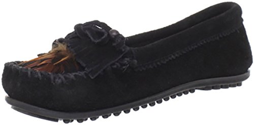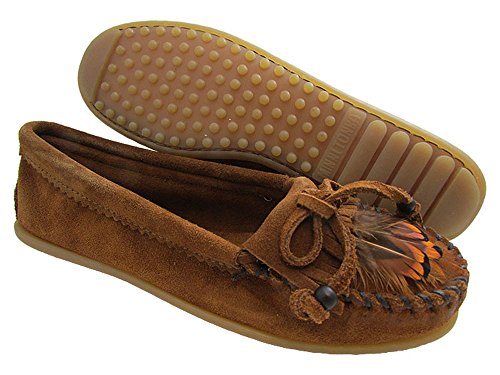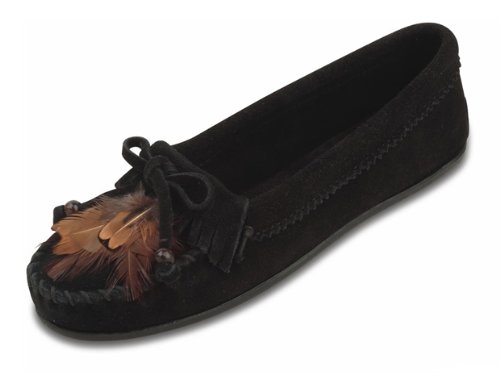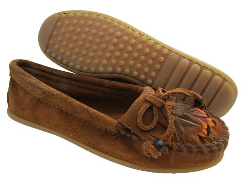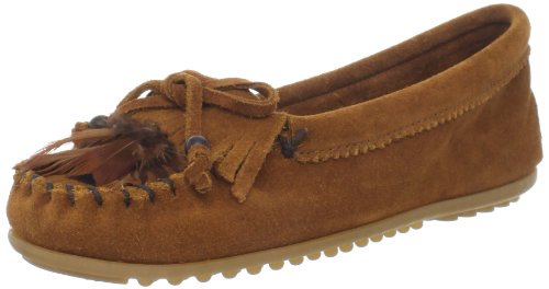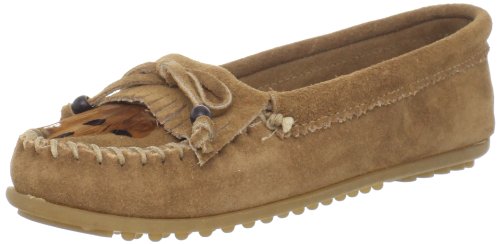 Classic moccasin with fringed vamp featuring whipstitched toe and pinked trim at topline