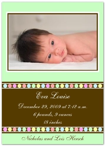 Studio : Storkie Express Publisher : Storkie Express Binding : Baby Product Product Description Birth Announcements: "Gumballs on Mint" features your baby's photo on this clean, contemporary design. The mint green background is complemented by a chocolate brown st 0