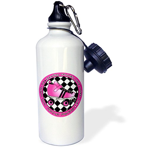 3dRose wb_28518_1 "Derby Chicks Roll With It Hot Pink Roller Skate and White" Sports Water Bottle, 21 oz, White