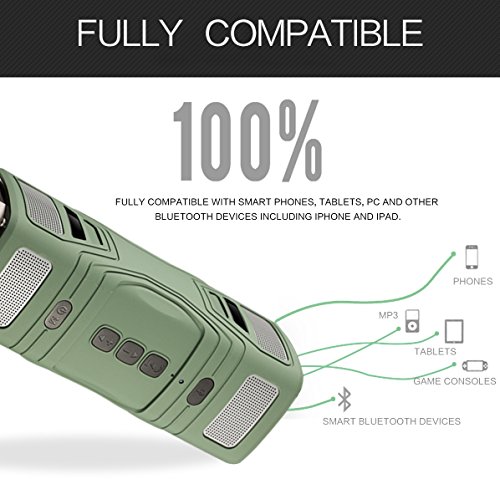 -. Feature : Free switch between 3 play modes: Bluetooth, TF Card, and Audio Input. Compatible with smartphone, tablet, computer, digital media player and so on / For outdoor activities: 2 thumping 5-watt speakers, loud enough; IPX5 waterproof, IP4 dustproof, shockproof, tough enough; 3 modes flashlight torch: SOS, bright and strobe, safe enough / 2200mAh lithium polymer battery, at least 8 hours music playing or 3 hours lighting / Audio file format supported: APE/ FLAC/ MP3/ WAV/ WMA, enjoy lossless quality music / Phone capabilities: if your phone is in the bag, operate on the speaker, answer and redial last call easily