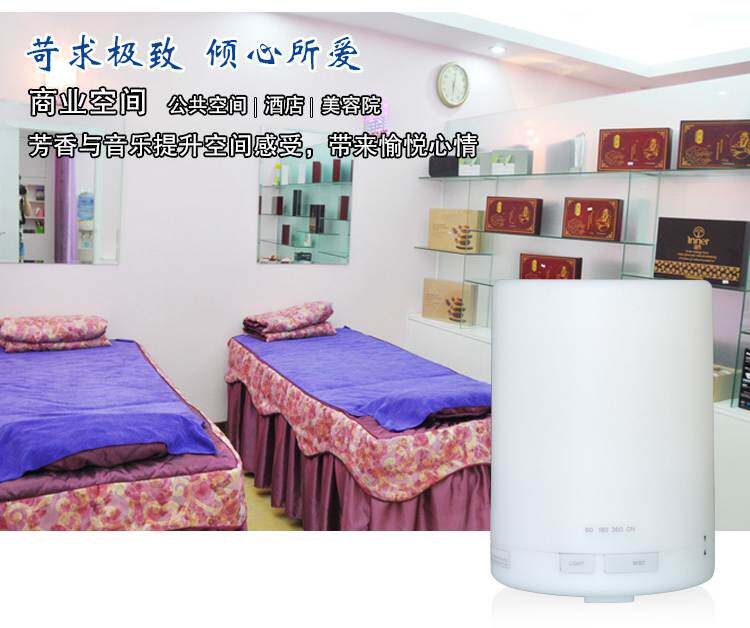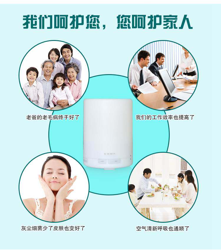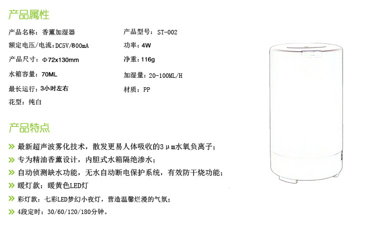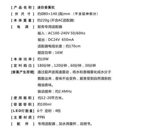 直径110MM,高154MM,6个LED灯,4个定时段(60分,120分,180分,ON)持续喷雾可达8小时。常用于卧室,客厅,办公室等场所。