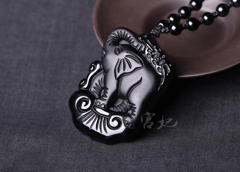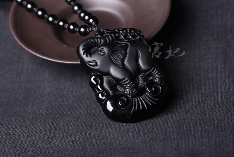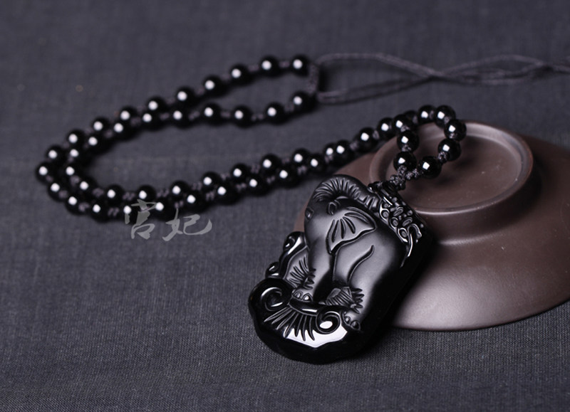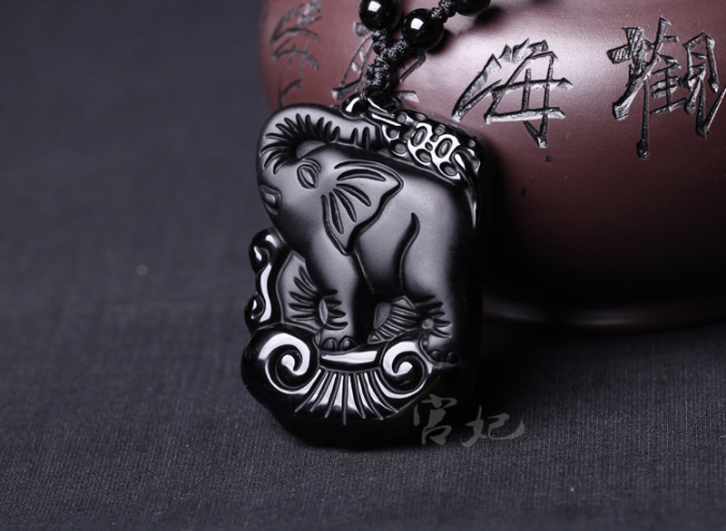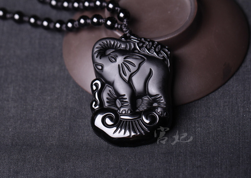 开光吉象采珠黑曜石吊坠 属牛2017年开运吉祥物男女款