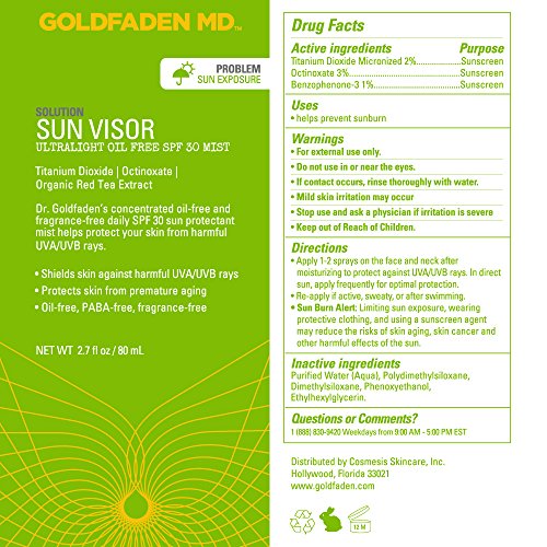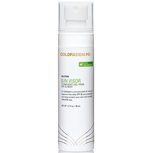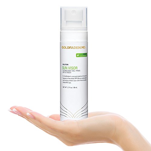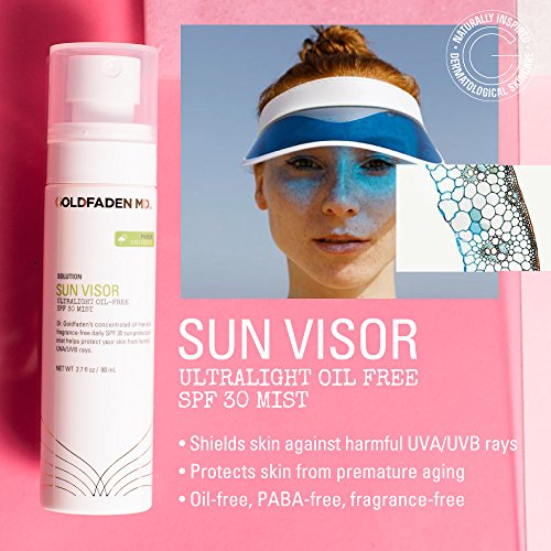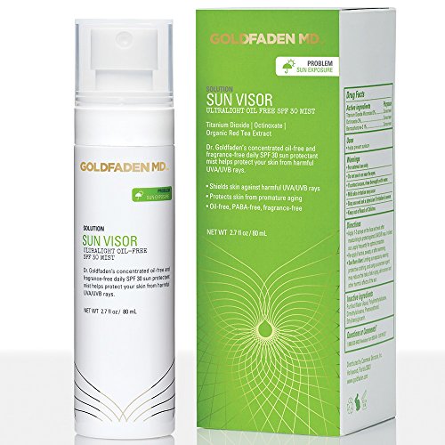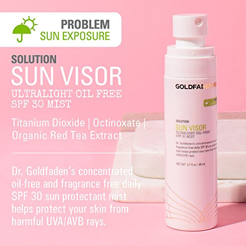 Dr. Goldfaden's ultra light weight, fast absorbing, no oil , PABA, fragrance or smear concentrated daily SPF 30 sunscreen spray works to help protect your skin from UVA/UVB rays which may help protect against premature aging. This unique formula is suited for men and women with all skin types including sensitive, problem prone, dry, oily, combination and mature, and offers dual action protection by delivering high level filters to help prevent the appearance of sun damage, fine lines, and dark spots. It contains a superior blend of protective agents including Titanium Dioxide, a natural physical sun protectant, Octinoxate, an absorber of harmful ultra violet light and Organic Red Tea Extract, known for its anti aging benefits, Red Tea Extract contains potent, natural antioxidants and enzymes such as Vitamin C, E, and Carotene that may limit the damaging and aging effect of radicals on the skin. To use, apply 1 to 2 spray pumps on the face and neck after moisturizing to help protect against rays. If using with make up, apply after foundation application. In direct sun, apply frequently for optimal protection. Usage Warnings: For external use only. Do not use in or near the eyes. If contact in eyes occurs, rinse thoroughly with water. Stop use and if redness occurs. Ingredients: Titanium Dioxide, Octinoxate, Benzophenone, Purified Water (Aqua), Polydimethyisiloxane, Dimethylsiloxane, Organic Red Tea, Phenoxyethanol, Ethylhexylglycerin. NOTE: This product does not contain nano particles. We are fully committed to your happiness, love our Sun Visor or we will make it right. MADE IN THE USA ABOUT DR. GARYFeature