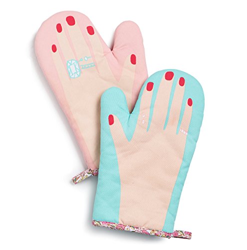 Celebrate Shop Set of 2 Pink & Blue Cotton Oven Mitts; Women's Hand with Big Diamond Ring
