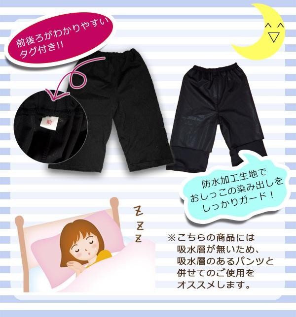 肌触りの良い綿100%の普通のズボンの裏に防水加工の生地が付いているので、見た目はそのままパジャマズボンなのにパンツから漏れたおねしょを防ぎます。(※この商品には吸水層がないため、おねしょパンツなどと併せてのご使用をおすすめします。) |