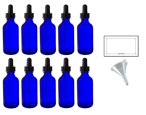 2 oz Cobalt Blue Glass Boston Round Dropper Bottle (10 pack) + Funnel and Labels for essential oils, aromatherapy, e-liquid, food grade, bpa free