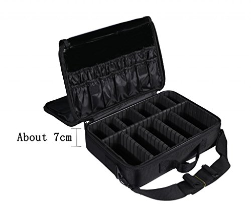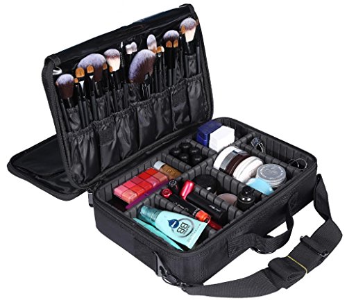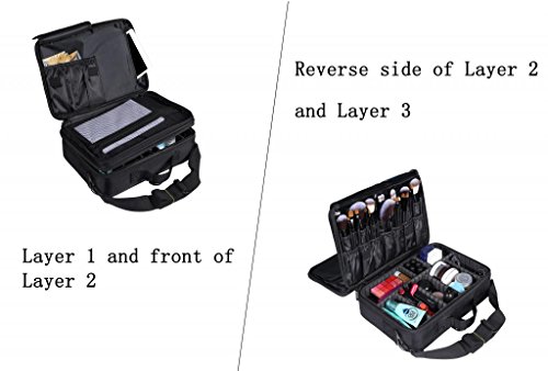 There are 3 layers. First Layer: One small no zipper pocket one large zipper pockets. Second Layer: One zipper net pocket for store some flat accessories like eye shadow, mirror, notes etc; 14 large slots for store varies makeup brushes( it has a flap to covers the brushes so it does not make your case dirty and the flap is plastic material that makes it easy to clean). Third Layer: 10pcs removable dividers allow you to design yourself internal compartments.