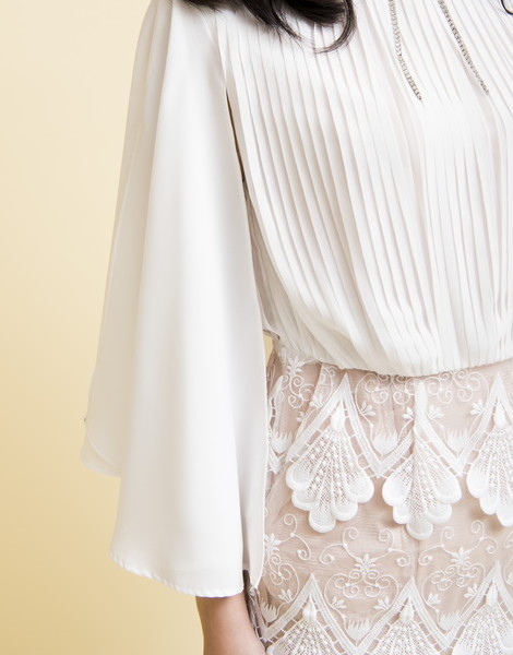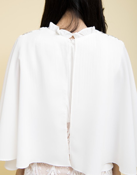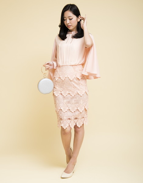 上品な印象のケープ付きワンピースは謝恩会やパーティにぴったりなアイテム。肩から続く繊細なビジューラインやスカートに使用している3Dレースなどこだわりポイントはどこにもないデザインです。ウエストの切り替え位置を高く設定しているので足長スタイルアップ効果が期待できます。