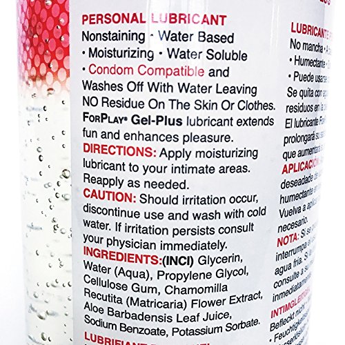 -. Binding : Health and Beauty -. Brand : Forplay -. EAN : 0036517214524 -. Feature : ForPlay® Gel-Plus Hypoallergenic America's Finest Water based Lubricant / Harmless if ingested, Silicone Toy Safe, Clear & Non-Staining / Water based, Washes of with water / FDA 510(k) cleared, Condom compatible / Made in the USA -. IsAdultProduct : 0 -. Label : Forplay Products -. Manufacturer : Forplay Products -. MPN : FRB3001 -. PackageQuantity : 1 -. PartNumber : FRB3001 -. ProductGroup : Health and Beauty -. ProductTypeName : HEALTH_PERSONAL_CARE -. Publisher : Forplay Products -. Studio : Forplay Products -. Title : Forplay Gel Plus Hypoallergenic 10.75 Oz with 2.2 Oz Tube Water based Lubricant -. UPC : 036517214524