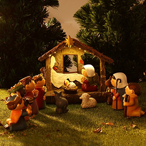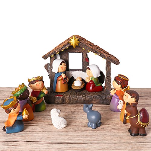 UNOMOR Shinning Nativity Scene Set for Christmas decorations, Set Stable with Moveable Figures, Mary Joseph Wisemans Sheep Donkey Camel, Resin, 12 Pieces