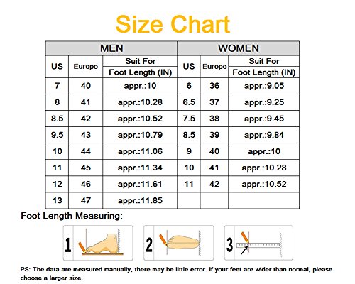 SIZE: Women US6 =EU36 =23.0cm/9.05" Foot Length Women US6.5 =EU37 =23.5cm/9.25"Foot Length Women US7 =EU38 =24.0cm/9.45" Foot Length Women US7.5 =EU39 =25.0cm/9.84" Foot Length Women US8 / Men US7 =EU40 =25.4cm/10" Foot Length Women US8.5 / Men US8 =EU41 =26.1cm/10.28" Foot Length Women US9 / Men US8.5 =EU42 =26.7cm/10.52" Foot Length Men US9.5 =EU43 =27.6cm/10.79" Foot Length Men US10 =EU44 =28.1cm/11.06" Foot Length Men US10.5 =EU45 =28.8cm/11.34" Foot Length Men US11 =EU46 =29.5cm/11.61" Foot Length Men US12 =EU47 =30.1cm/11.85" Foot Length