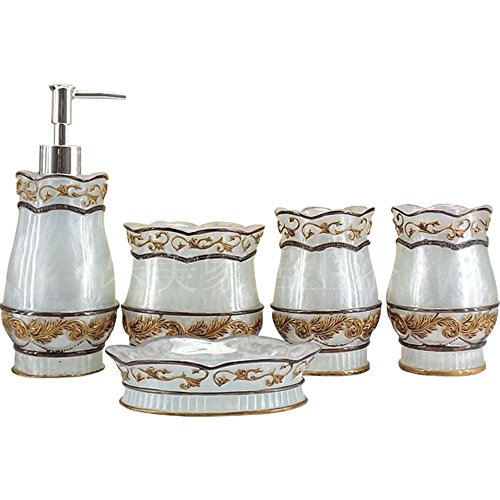 - QUALITY RESIN BATH ACCESSORY; the Marquee 5-Piece Bath Accessory Set is made of durable resin that can easily last a lifetime! Soap remnants don't adhere to the surface of the resin, meaning that you can easily clean up every piece in the set.