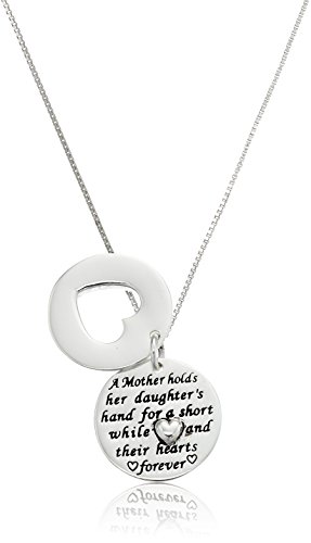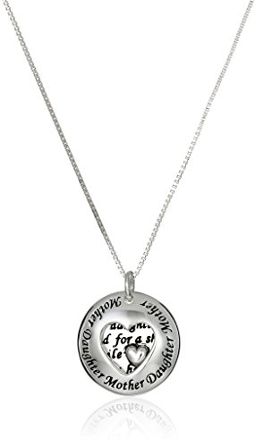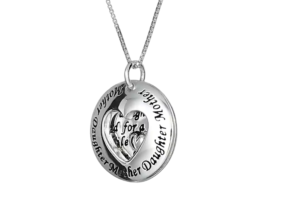 Two-piece round pendant with "Mother Daughter" engraved at border of heart cutout front piece and engraved message and applied heart on bottom piece^Messaging on bottom pendant reads: "A Mother holds her daughter's hand for a short while and their hearts forever"^18" box chain with spring-ring clasp^Imported