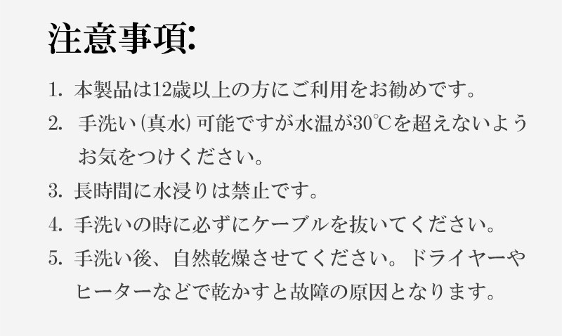 | 注意事項 | 1.本製品は12歳以上の方にご利用をお勧めです。 2.本製品は手洗い可能ですが水温が30℃を超えないようお気をつけください。 3.手洗い後、自然乾燥させてください。ドライヤーやヒーターなどで乾かすと故障の原因となります。 4.本製品は充電式ではありません。電源がない場所でご利用する際、モバイルバッテリーが必要になります。 5.モバイルバッテリーは別売りとなります。 6.ご使用した際、必ず出力5V2AのUSBボートに接続してご利用ください。 |