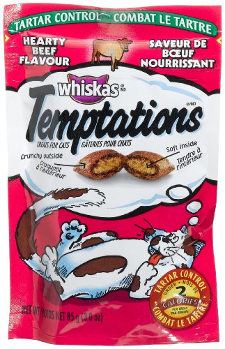 - Feature : "WHISKAS" TEMPTATIONS BEEF CAT SNACK / Size: 3 Oz. / 100% nutritionally complete. / Under 2 calories per treat. / A tasty, crunchy outside & irresistible, Soft Center.