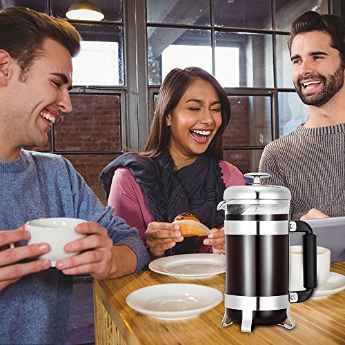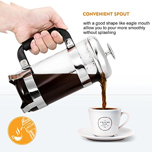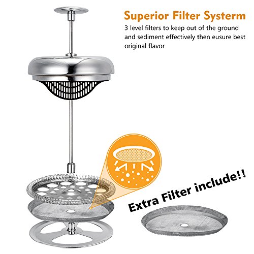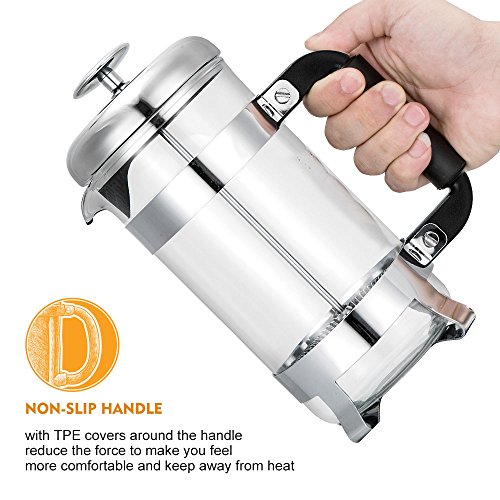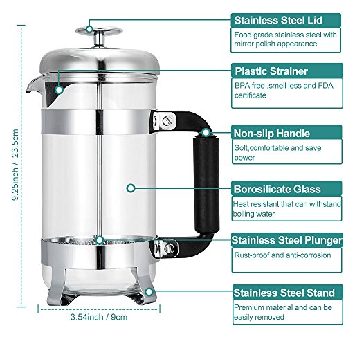☕Multi-Use with Premium Service---The French Press Coffee Maker can be used as a coffee pot or tea pot and perfect to prepare coffee, espresso, iced tea, espresso beverages, frothed milk, lemonades, hot chocolate, fruit infusions, plant tinctures, rinse quinoa. And if any parts are broken, please contact us for the replacement, we supply 12 month warranty