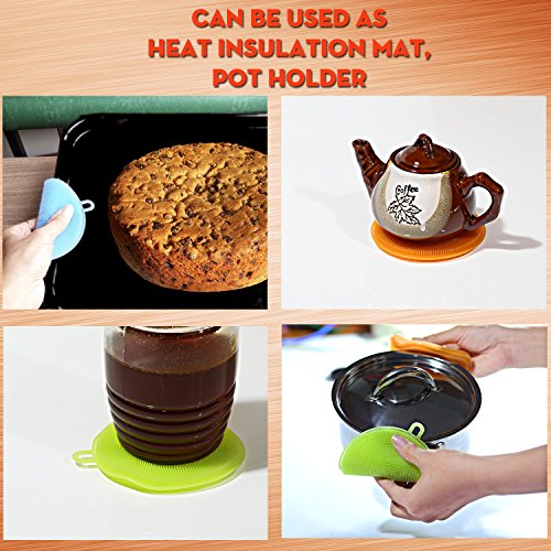 - ✔ AMAZING VALUE: Includes 6-piece silicone dish scrub with 3 colors, 6 PCs scouring pad with random colors, 3 PCs adhesive wall hooks + bonus 3 PCs orange cutter peeler & eBook (Usage Instructions). At an all-time low, introductory price.