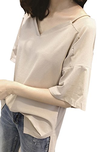 -. Title : (ニャンドゥー) Nyan-Deux レディース Vネック スリット Tシャツ カットソー 肩出し オフショルダー (ベージュ,XL)
