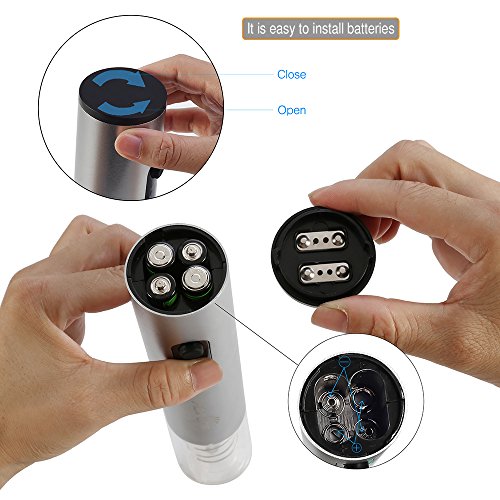 NOTE: 1.First to use the Electric Wine Opener you should Load the 4 AA battery(not included). 2. For your safety,never useyour hand or fingers to touch the bottom of the opener and keep it away from children to avoid any hurt. 3. Don't wash the opener with water,or soak it intowater 4.Read carefully the user manual before using