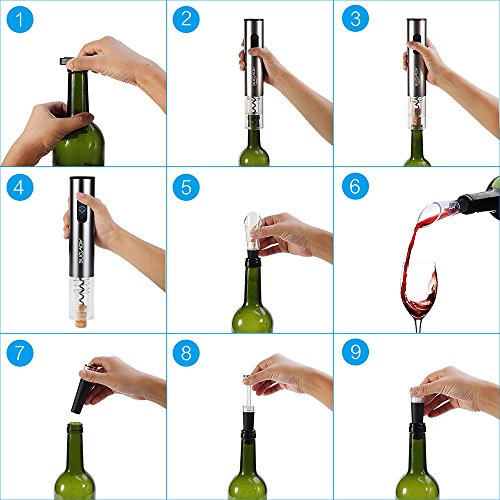 How to use the electric wine opener? Before removing the cork, any foil seal covering the cork must be removed first. A handy foil cutter comes included making the task quick and easy. Place the wine opener on top of a wine bottle, making sure it remains in an upright position and not at an angle to the bottle. Simply press the lower part of the switch to start. The corkscrew spiral will turn to enter the cork, then it will gradually remove the cork from the bottle, stopping once the cork has been fully removed from the bottle Lift the electric wine bottle opener away from the bottle, and remove the cork by pressing the upper part of the switch--the spiral turns in the opposite direction to release the cork