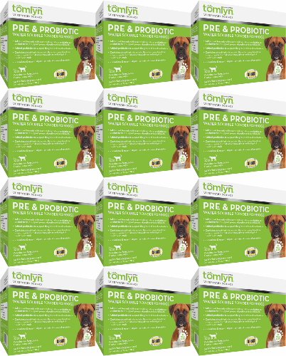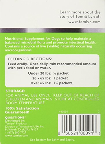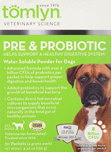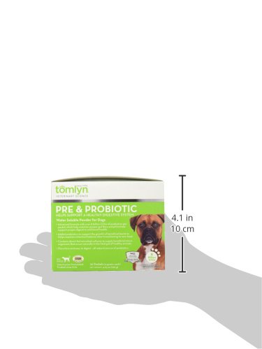 Tomlyn’s Pre & Probiotic Supplement for Dogs helps support balanced microbial flora and promotes intestinal health. Contains a source of live (viable) naturally occurring microorganisms. Advanced formula with over 8 billion CFUs of probiotics per packet to help support proper digestive and bowel health. Added prebiotics to support the growth of beneficial bacteria. Contains direct-fed microbial cultures to supply beneficial microorganisms that occur naturally in the hind gut of healthy animals. This water soluble, flavorless & easy to digest is a natural source of probiotics. Each box contains 30 packets for convenient daily use.Feature