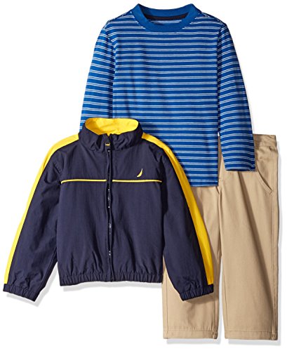 Nautica three piece outerwear set that features an anchor jacket, woven shirt and pants.