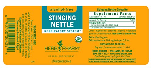 ReleaseDate : 2013-09-20 Studio : Herb Pharm Publisher : Herb Pharm Binding : Health and Beauty Product Description Herb Pharm Stinging Nettle extract works with the body’s natural mechanisms to support the respiratory system*. Herb Pharm prepares Stinging Nettle from spring-harvested Urtica dioica plants which are Certified Organically Grown. Stinging Nettle extract is easily dosed and taken in liquid form. It may be added to water or other liquid for taste and is easily absorbed into the bloodstream. Stinging Nettle has a rich vegetal taste and is slightly salty. Herb Pharm never uses synthetic solvents. The company's farm is Certified Organic, Bee Friendly, and Salmon Safe. Herb Pharm is the #1 selling liquid herbal extract brand in US Natural Food (SPINS). Herb Pharm is a company of herbalists, scientists, and farmers in GMO-free Josephine County, OR. There, they have been cultivating herbs with care, precision, and respect for nature since 1979. * This statement has not been evaluated by the FDA. This product is not intended to diagnose, treat, cure, or prevent any disease. 0