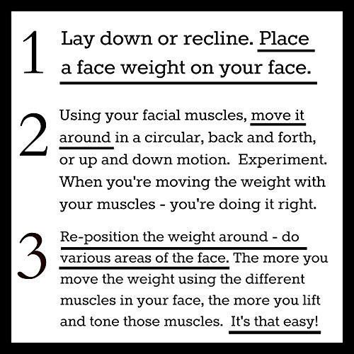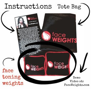 Facial Toning & Face Lifting System includes: 1 medium size weight (jowl lifter/cheek toner) and 1 smaller weight (lip plumper/brow lifter). Plus tote bag! These weights feature our non-skid materials designed to stay on skin during facial work outs. Also included are quick and easy instructions for your 3 to 5 minute work out. Weights come with our convenient Face Weights tote bag. Tone and sculpt your face in a matter of days!