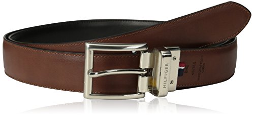 Reversible dress belt with polished-nickel single-prong buckle featuring logoed keeper