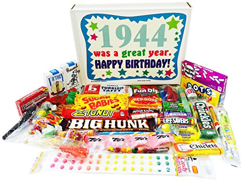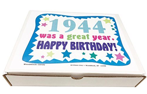 -. Binding : Misc. -. Brand : Woodstock Candy -. Feature : Contains 40 kinds of candy a 73 year old will remember from their youth / Makes a great gift for someone who has everything / Everyone loves candy! / Comes shrink wrapped in a box that measures 11.75" x 9" x 2" / Box reads "1944 was a Great Year. Happy Birthday!" -. IsAdultProduct : 0 -. Label : Woodstock Candy -. Manufacturer : Woodstock Candy -. PackageQuantity : 1 -. ProductGroup : Grocery -. ProductTypeName : GROCERY -. Publisher : Woodstock Candy -. Studio : Woodstock Candy -. Title : 1944 73rd Birthday Gift Box of Nostalgic Candy from Childhood