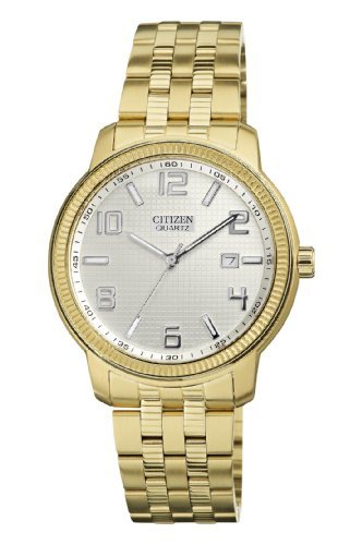 Citizen BI0992-51A Quartz women's watch features a 44mm wide and 9mm thick gold plated solid stainless steel case with a coin edge fixed bezel and textured push-pull crown. Citizen BI0992-51A is powered by quartz movement. This beautiful watch also features a textured white dial with white accents silver tone luminous hands and hour markers along with the date display function, scratch resistant mineral crystal and water resistant to 50 meters. Citizen BI0992-51A is equipped with a 20mm wide gold plated solid stainless steel bracelet with push-button fold-over safety clasp. Citizen BI0992-51A women's Quartz white dial gold plated steel bracelet watch is brand new and comes in an original Citizen gift box and is backed by a 5 year limited warranty.