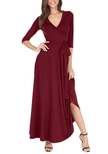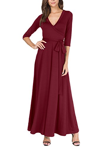 Womens Fall Vintage 3/4 Sleeve V Neck Loose Swing A Line Maxi Tea Dress Wine L
