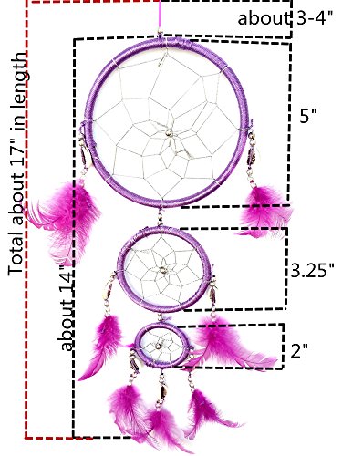 Size ( Please see additional picture): about 14" from the top of the big ring to the bottom feathers; the hanging string is about 3-4". Total about 17"-18" in length