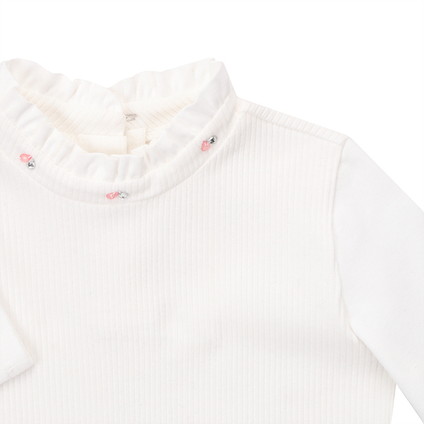 상세설명-면스판소재로 착용감이 편안하며 목부분의 프릴장식이 여성스러운 느낌을 주는 티셔츠입니다.