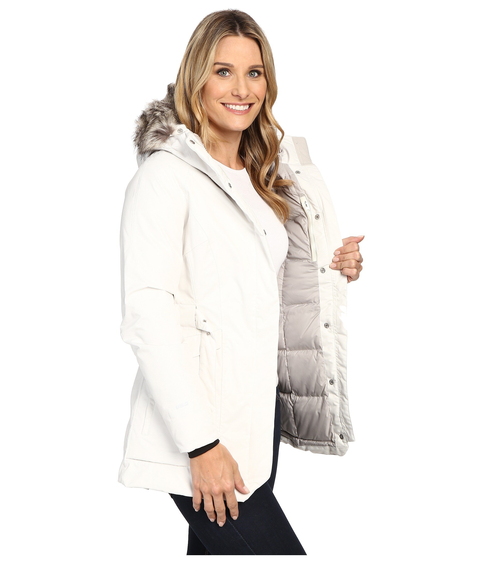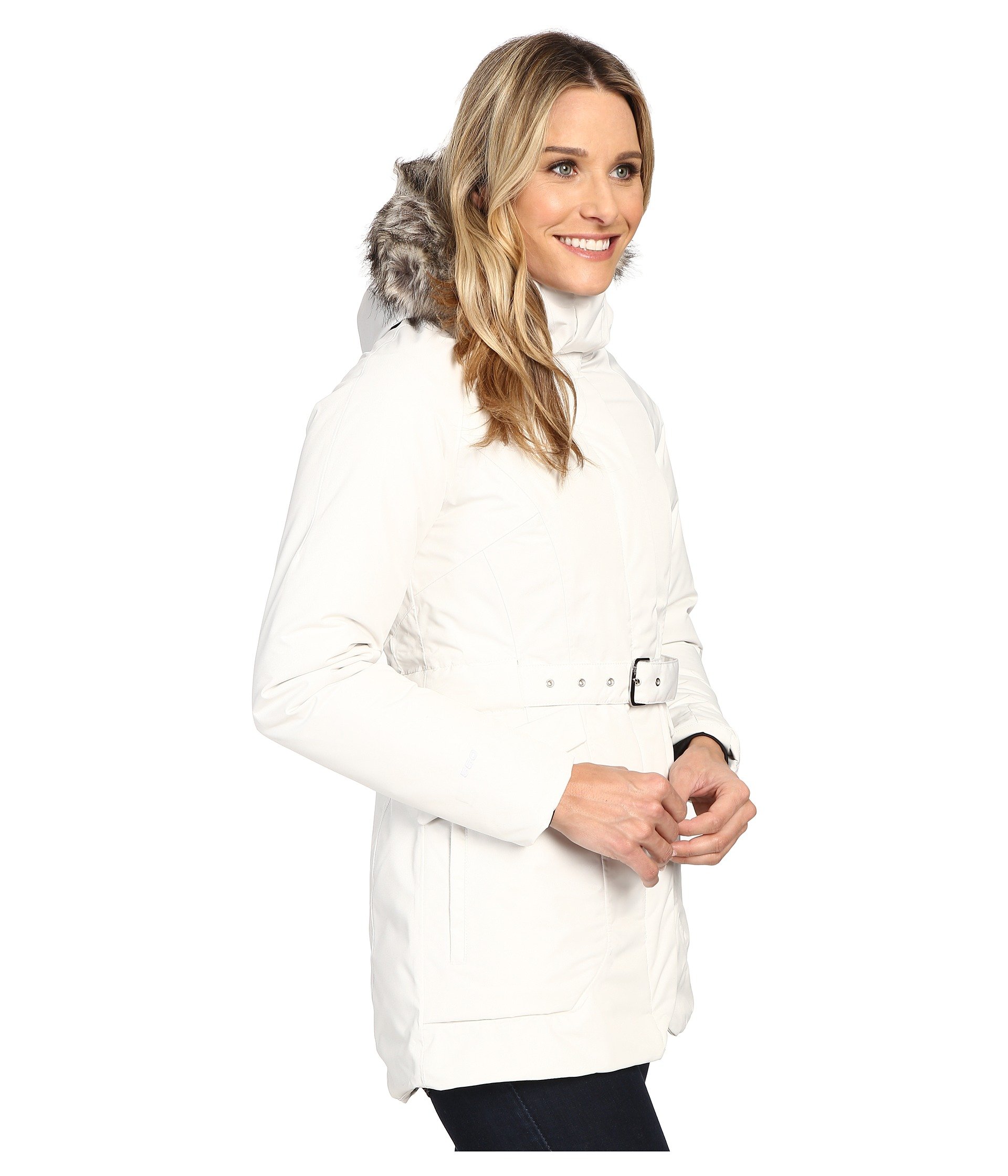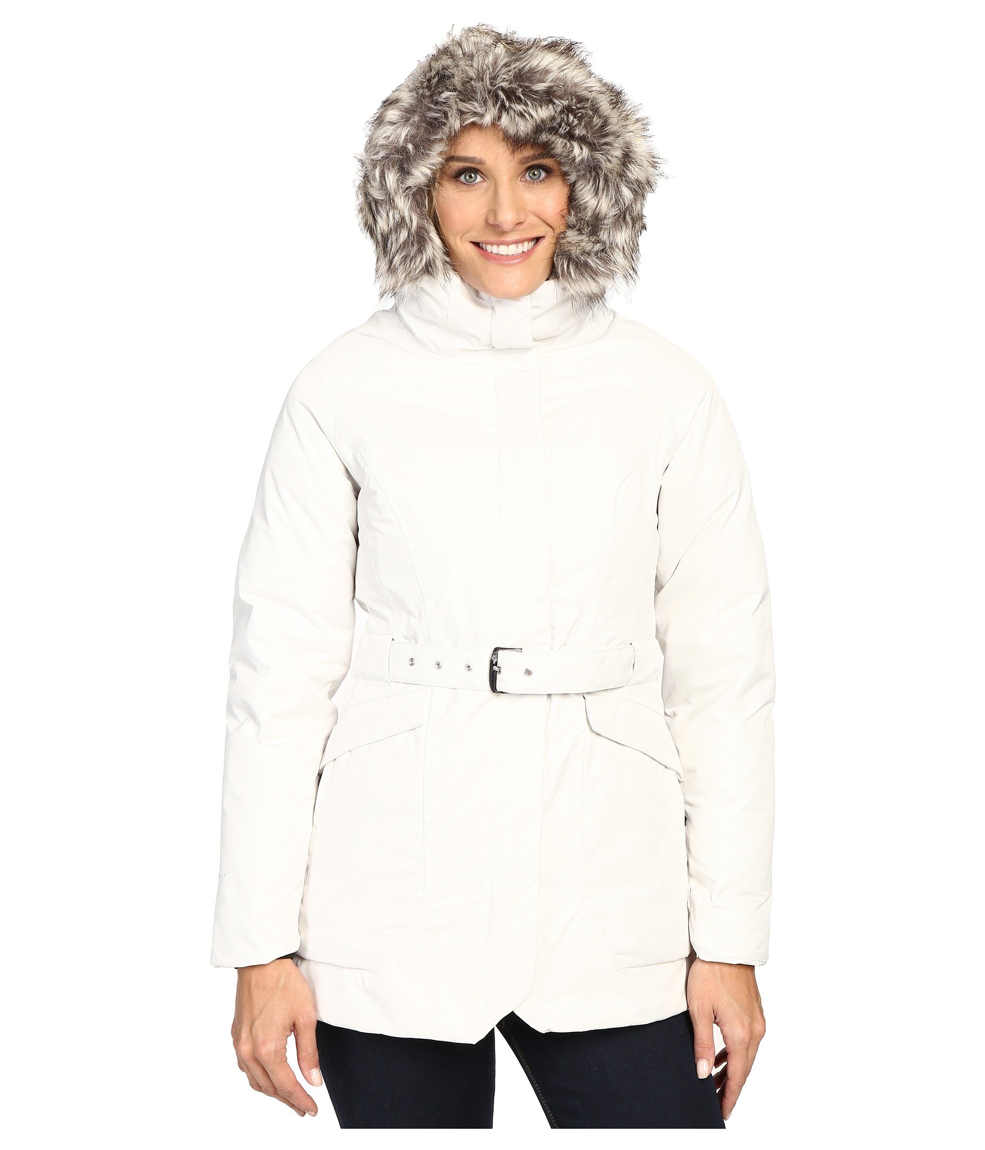 | Product Information SKU: #8698752Please note that this style is either discontinued and/or from a previous season.Rely on this beautifully constructed jacket to protect your upper body and hips from exposure to the elements during those chilly commutes.DryVent™ 2L shell with Durable Water-Resistant (DWR) coating protects the high-loft 550-fill down for reliable thermal insulation.Slim upper body with internal elastic at back for a flattering fit.Adjustable best at waist for a fashionable and customizable fit.Internal media pocket with cord guide.Zippered hand pockets.Attached hood with removable cozy faux-fur trim.Embroidered logo at left chest and back right shoulder.Body: 100% polyester DryVent™ 2L; Lining: 100% polyester; Insulation: 550-fill down.Machine wash cold, tumble dry low.Imported.Product measurements were taken using size XS. Please note that measurements may vary by size.Measurements: Length: 31 in |