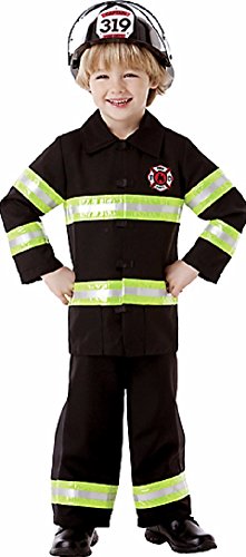 Features black jacket and pants with firefighter's insignia and yellow and silver reflective trim.