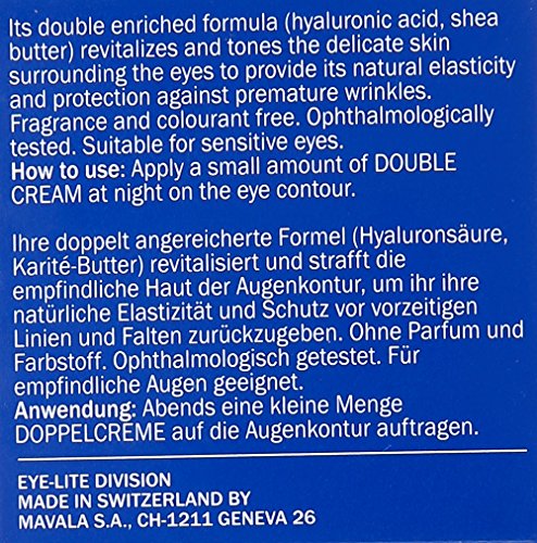 Mavala Eye-Lite products help you to make the most of your eyes. The products are not only for beauty, but actually care for lashes and the delicate skin of the eye contour. The eye contour is the most fragile part of the face and to avoid irritations has to be protected and moisturized. Mavala Double Cream is a moisturizing treatment which helps prevent the development of wrinkles around the eyes. Its formula contains active ingredients, such as Malvhydran complex and hyaluronic acid which revitalize, firm and moisturize the delicate skin surrounding the eyes.Feature