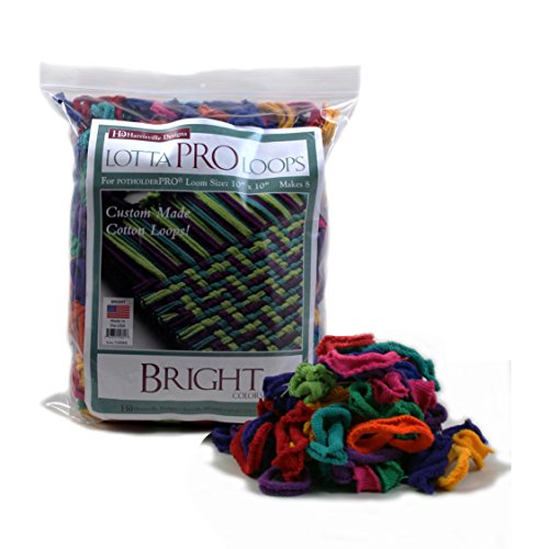 Makes Eight (8) beautiful 8-inch x 8-inch potholders with this bag of Assorted Bright Cotton PRO Lotta Loops, using the Harrisville Designs original, sturdy, long lasting 10-inch x 10-inch metal potholder PRO Loom (sold separately)