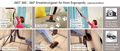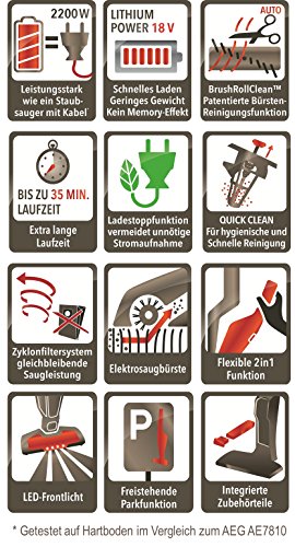 -. Feature : Made in Europe / Das intelligente Ladesystem schaltet automatisch ab / Patentierte Selbstreinigung der Bürstenrolle per Pedaldruck / Kabelloser Handstaubsauger mit Zyklon-Technologie: immer und überall einsetzbar, dank hochwertigen Bürsten-Fasern auch für empfindliche Bodenbeläge wie Parkett perfekt geeignet. / ERGORAPIDO plus lithium 2in1, Akku-Ladeanzeige und Betriebsanzeige, abnehmbarer Akkuhandsauger / Extra lange Laufzeit von bis zu 35 Min., 18 V Lithium Power-Akku*, 2 Leistungsstufen / Motorbetriebene Saugbürste mit Doppelgelenk und 4 starken LED-Leuchten / Freistehende Parkfunktion: Der Ergorapido kann überall und immer abgestellt werden / Integriertes Zubehör: Fugendüse und Bürste in Ladestation integriert; Optionales Zubehör: AEG Erweiterungsset AKIT360 und AEG Austauschfilter AEF 144 / *Getestet auf Hartboden im Vergleich zum AEG AE7810
