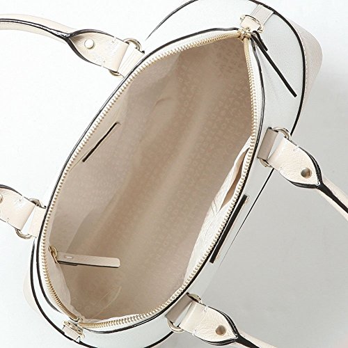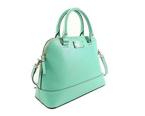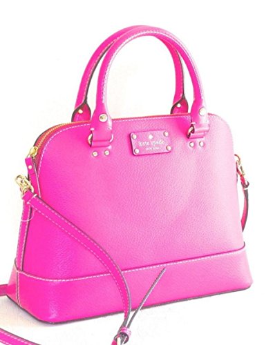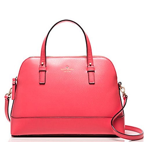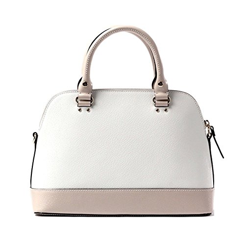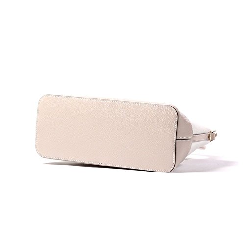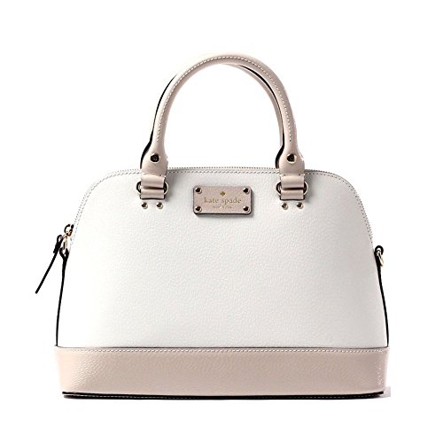 Wrapped in Cream/Pebble textured leather with light gold plated hardware. This structured and rigid satchel is lined in custom Kate Spade logo printed fabric and has an inner zippered pocket and two open slip pockets. It has a fully zippered top closure. The front is accented with Kate Spade nameplate and it has a flattened bottom panel. There are dual rolled leather handles that have a drop of about 4", or you can use the removable and adjustable shoulder and cross-body strap. The overall measurements are approximately 12.5" (L) at the bottom tapering to 10" (L) at the top x 9.5" (H) x 5" (W).Feature