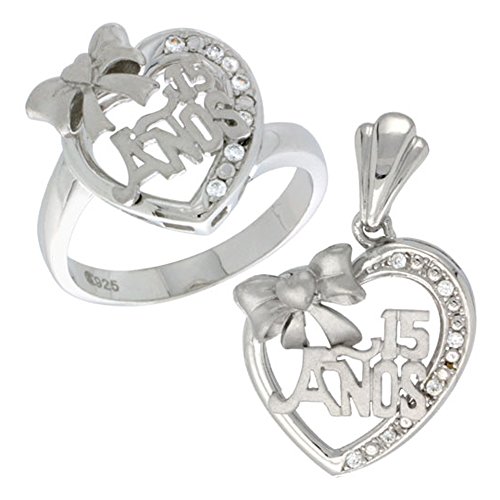 -. Title : Sterling Silver Quinceanera 15 Anos Bow Heart Ring & Pendant Set CZ Stones Rhodium Finished