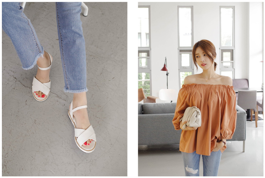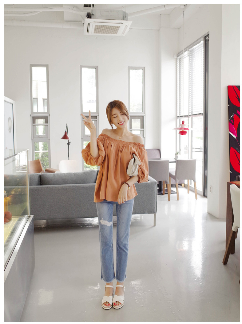 살짝 올려서 보트넥으로 입어도 예쁘구요. 요즘엔 오프숄더로