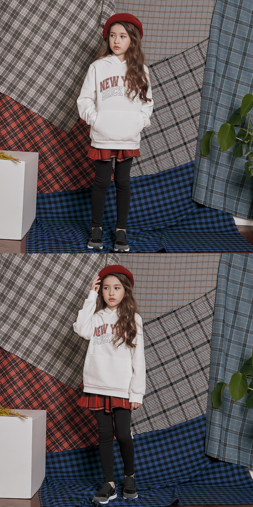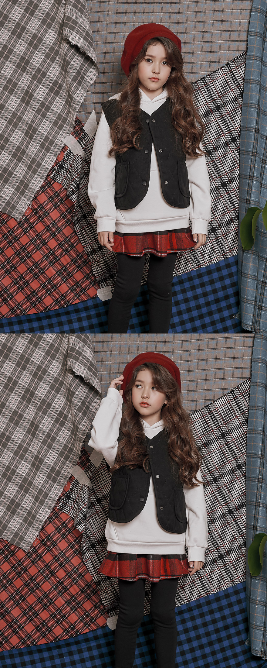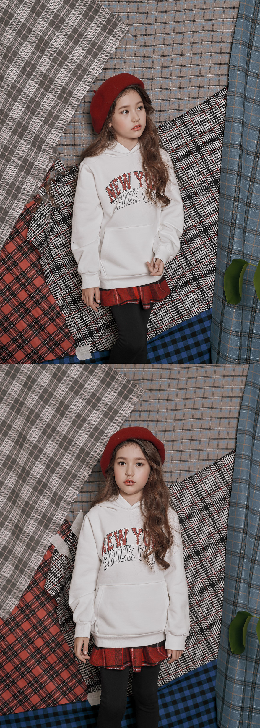 따뜻한 색감에 예쁘게 퍼지는 핏의 모직 체크 치마에 부드러운 밍크 안감 레깅스를 덧데어준 제품이에요~ 모델 아이처럼 후드티, 맨투맨 등과 매치해 캐주얼하게 코디해 주셔도 좋고 셔츠, 블라우스 등과 함께 입혀주셔도 어울리는 스타일리쉬하면서 실용적인 아이템이에요;)