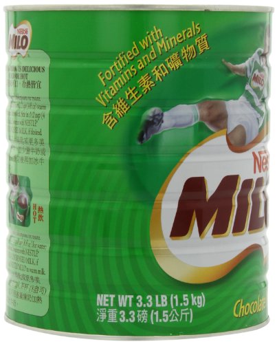 Nestle Milo chocolate beverage mix jumbo tin contains 3.3 pounds of Milo. Milo is nutritious energy drink kids love. Just one glass of Milo with milk provides children with 50% of their daily iron, calcium, Vitamin B1 and Vitamin C needs. Drinking milo gives kids calcium for strong bones and teeth, iron to carry oxygen around the body, b vitamins (B1 & B2) to release energy, vitamin C for iron absorption, vitamin A, which is essential for healthy eyesight, plus, each glass of milo is low GI.Feature