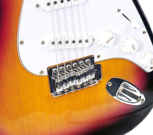 - Feature : Electric Guitar Features: / Color: Sun-Burst - Body type: Basswood - Controls: 1 volume, 2 tone - Number of pickups: 3 / Type of pickups: Single pickups - String type: Metal - Fretboard material: Rosewood - Neck material: Maplewood - Nut width: 1.7 Inches - Scale length: 25.5 Inches / Amplifier Specifications: / Rated power output: 10 watts - Nominal input level <700mV (RMS) - Speaker size: 6.5 Inches - Controls: Volume, channel select, switch, gain, treble, middle, bass - Power supply: 110V @ 50 Hz - Power consumption: 0.012 W/h / Electric Guitar Features: / Color: Sun-Burst - Body type: Basswood - Controls: 1 volume, 2 tone - Number of pickups: 3 / Type of pickups: Single pickups - String type: Metal - Fretboard material: Rosewood - Neck material: Maplewood - Nut width: 1.7 Inches - Scale length: 25.5 Inches / Amplifier Specifications: / Rated power output: 10 watts - Nominal input level <700mV (RMS) - Speaker size: 6.5 Inches / Controls: Volume, channel select, switch, gain, treble, middle, bass - Power supply: 110V @ 50 Hz - Power consumption: 0.012 W/h