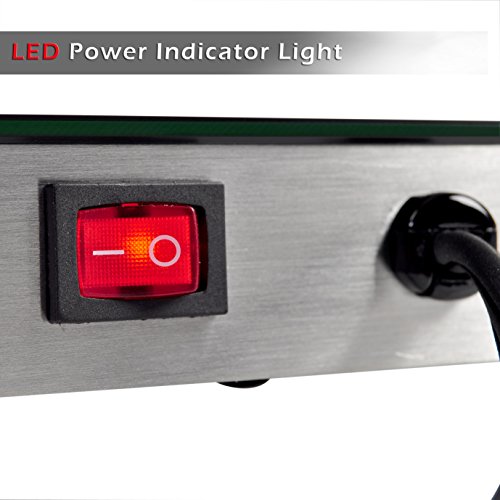 TABLETOP SAFE: The hot food warmer features stainless steel construction and non-stick, heat-resistant tempered glass. The high-powered heating element heats quickly and the ultra-thin space saving design is safe for placement on any table or counter.